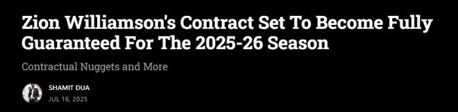 截止时间一过,锡安·威廉姆森下赛季那份3944万美元的薪水,稳了,正式转成了全额保障。