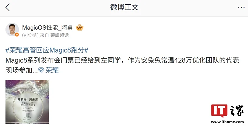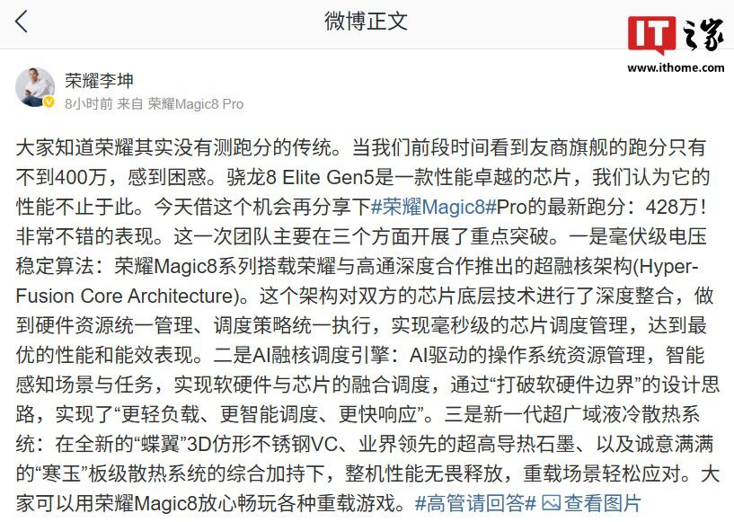 IT之家注意到,荣耀性能优化研发工程师 @MagicOS性能_阿勇 今日透露,荣耀 Magic8 Pro 手机的 428 万跑分是在常温状态跑出的。